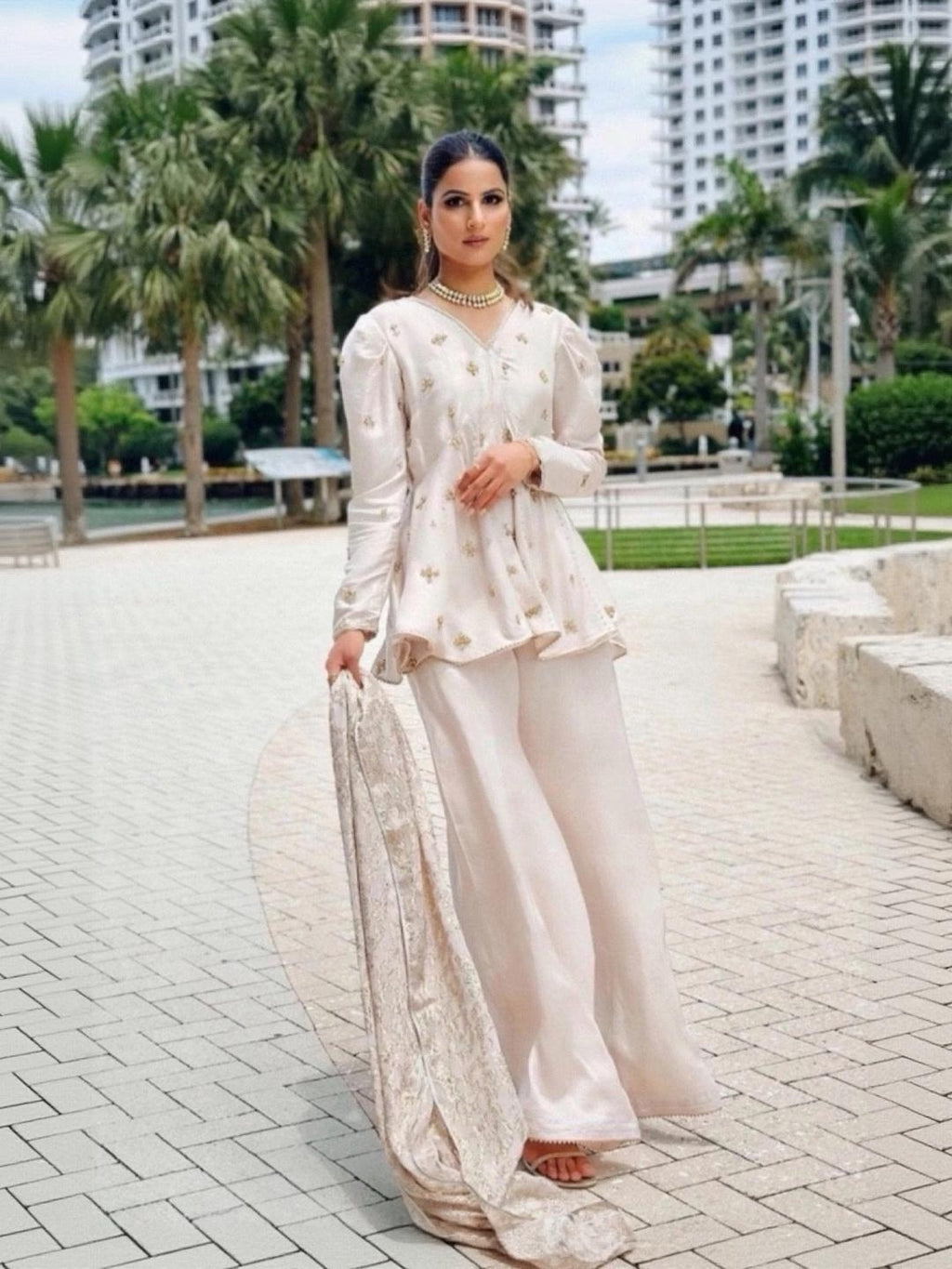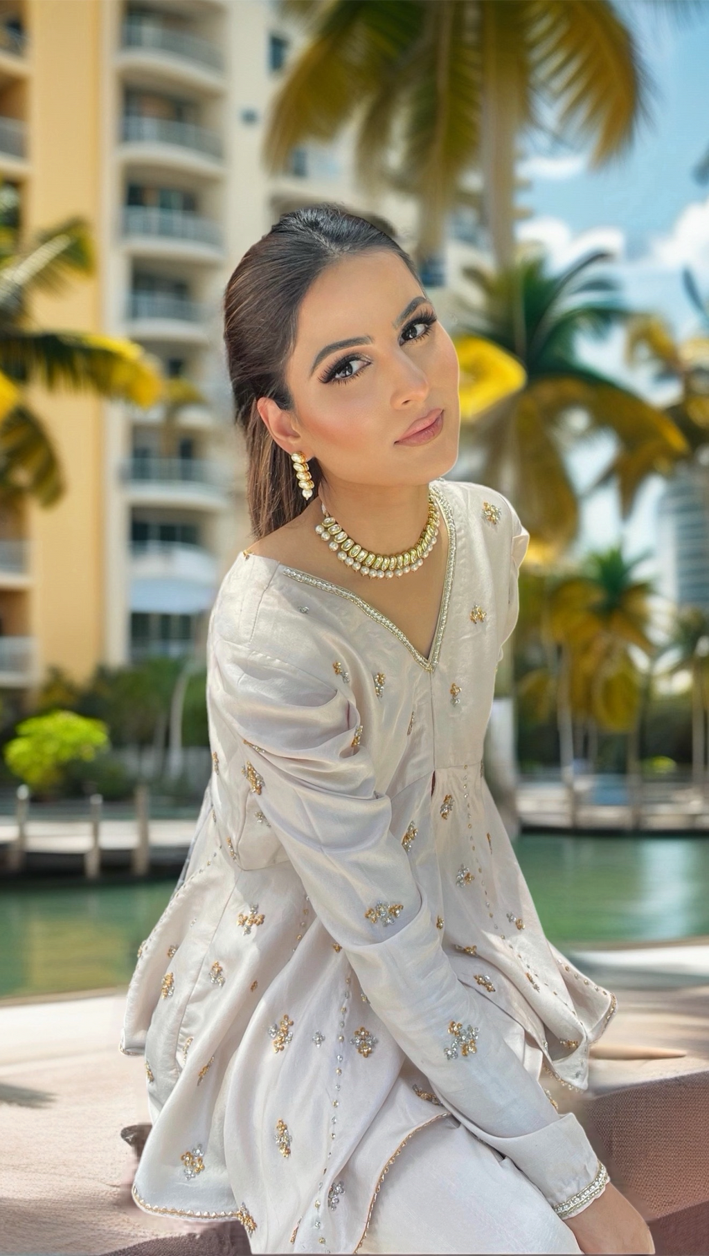 Experience the ultimate fusion of old world aesthetics and trendy fashionista style with Lena. Crafted on shisha silk, this designer piece features stunning floral hand embellishments and is sure to turn heads. Our favorite look, now yours too.
