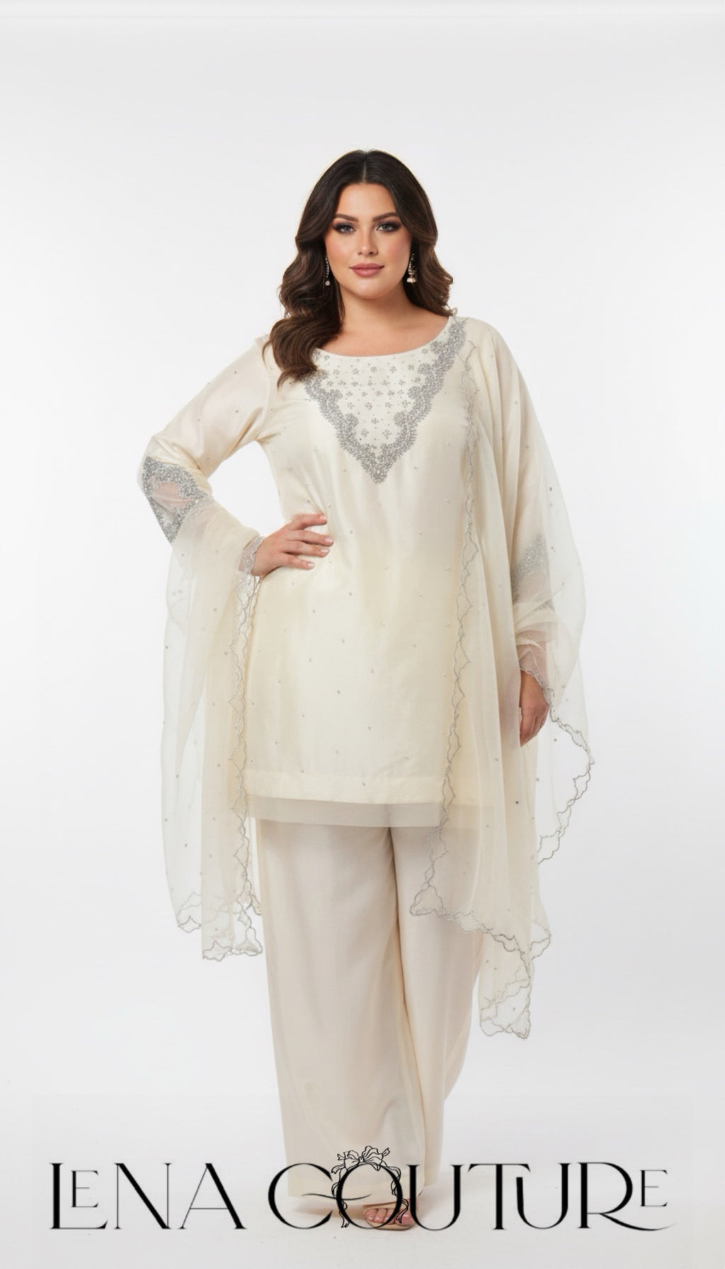 Look effortlessly chic in the timeless classic Samar Set. Crafted from premium quality sheesha silk, this set features a short kameez and farshi shalwar, paired with a dainty scalloped organza silk dupatta. With its ethereal off-white color, this set exudes elegance and style. Make a statement in this must-have addition to your wardrobe.